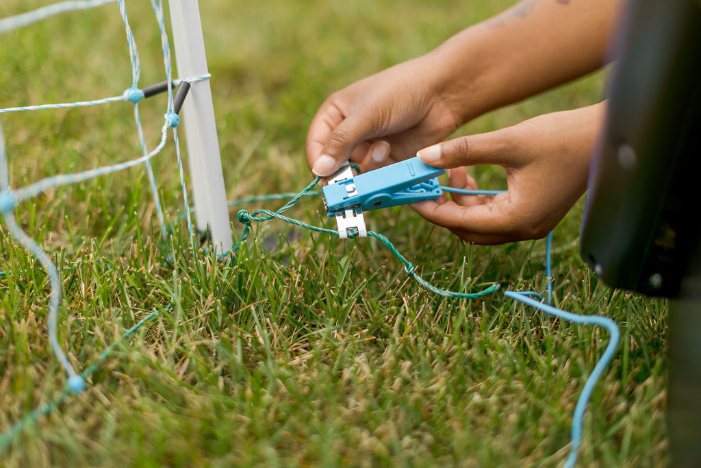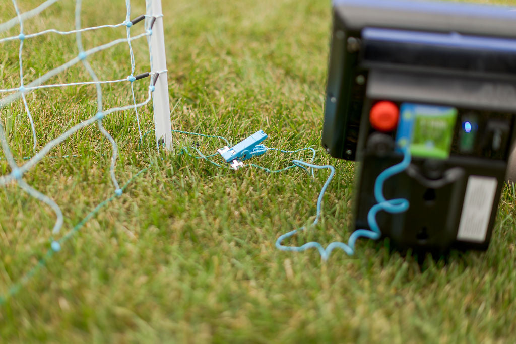 Simply connect the ground (⏚) terminal of the fence energizer to the connection point on the bottom strand of the +/- netting, and connect the positive (🗲) terminal to the connection point near the top strand of the netting.